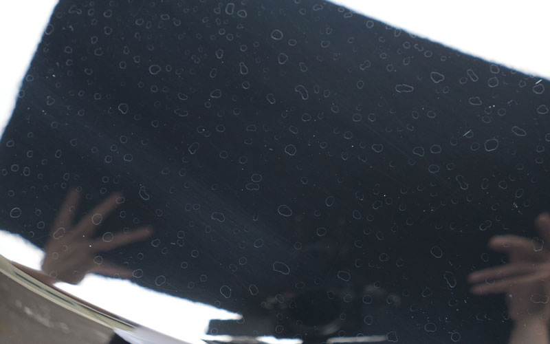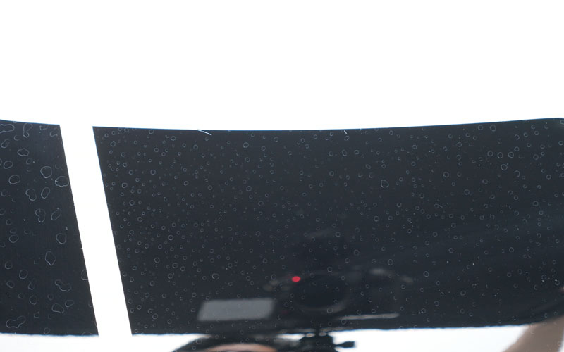 水をかけてみたら未施工箇所は少し水が弾いていました。『AIR』は微撥水?疎水? そんなことより、さっきまでバチバチに弾いていた『HYDRO』を施工していた場所まで『AIR』に侵されました。『AIR』で拭いたことにより上に乗ったのか『HYDRO』が落ちたのかは不明。