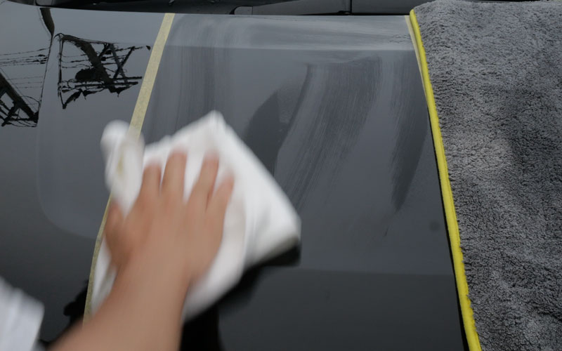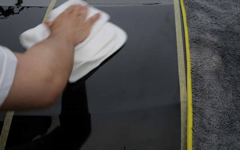 20~30秒ぐらい待ってから拭き上げます。ムラが取れにくいです。タオルを変えて拭き上げたらマシになりましたが、『AIR』『RIDE』に比べてムラないやすいと思いました。手触りは確かにワックス感があってウェットな感じですが、今のところ1番施工が難しい商品です。