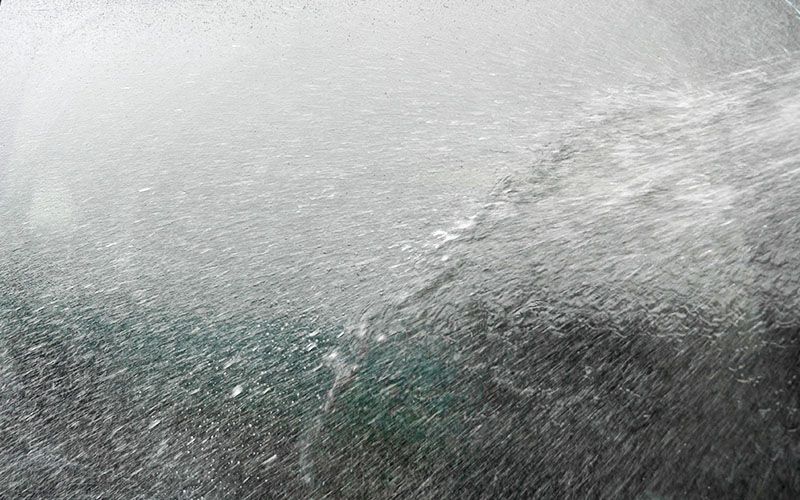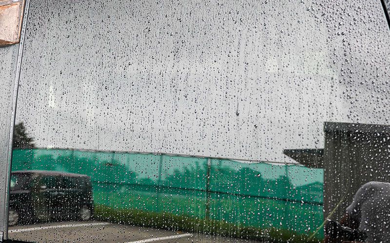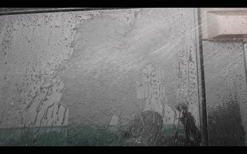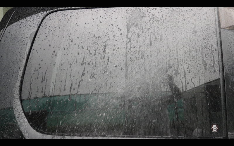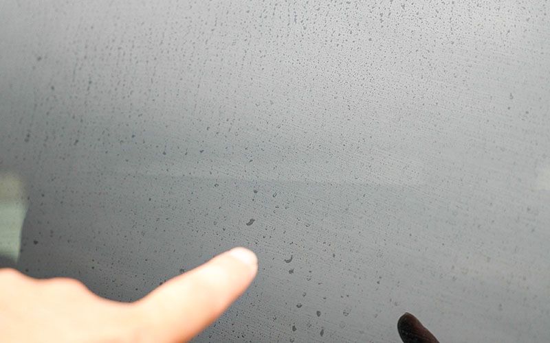 先ほどと反対の窓ガラスです。油膜と古いコーティングで水を弾いている状態です。