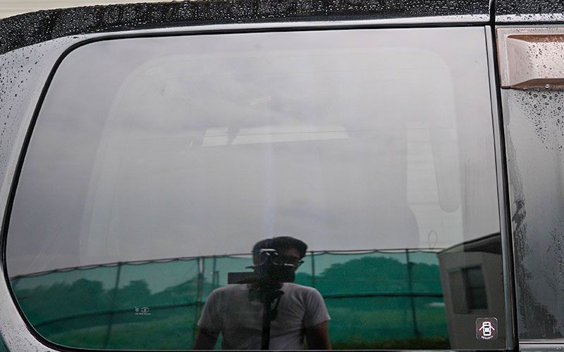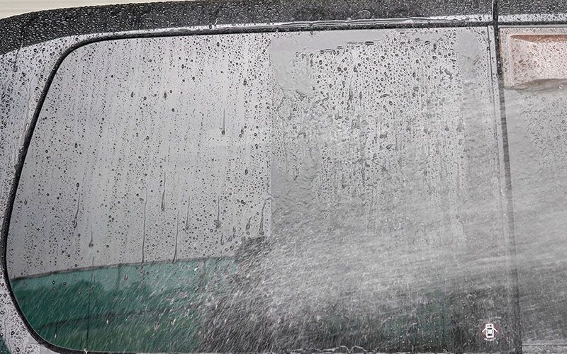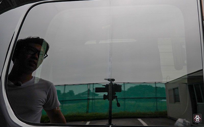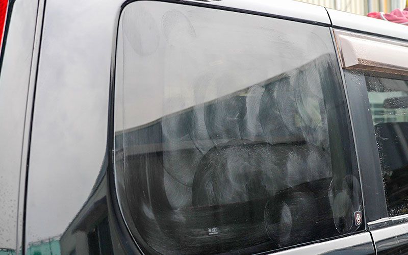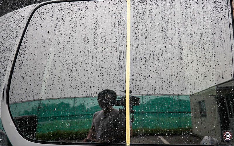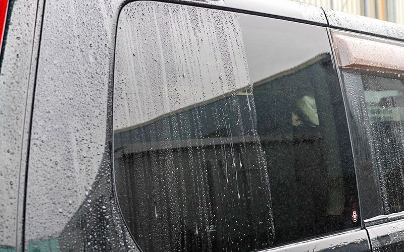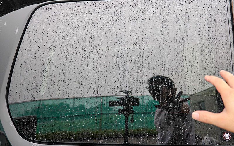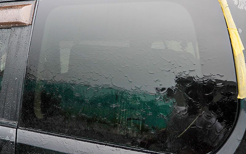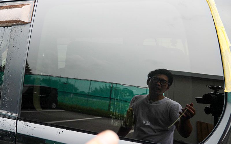 今回はこちらのサイドガラスを使用していきます。現状は古いコーティングと油膜で水を弾いている状態ですね。