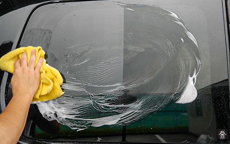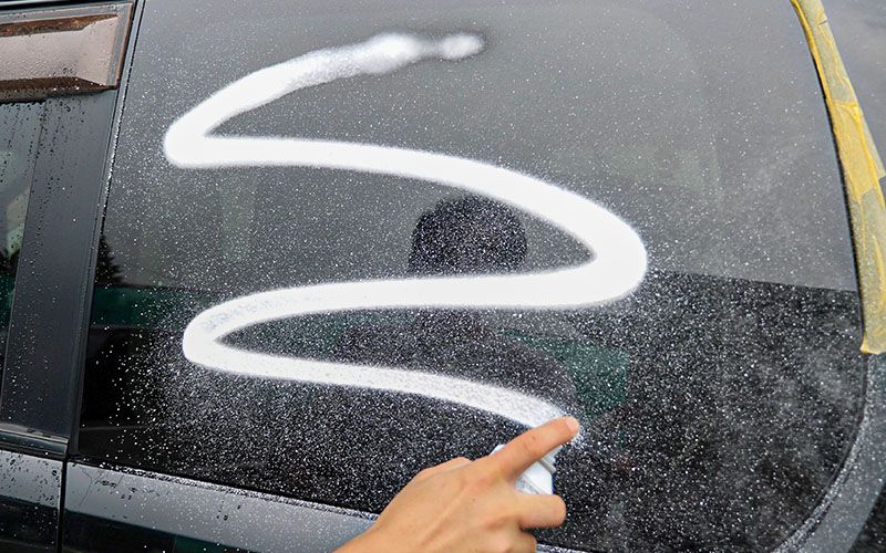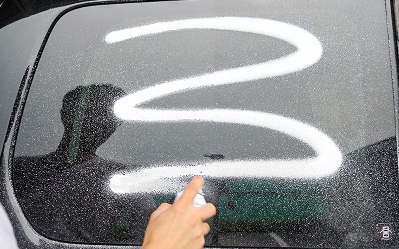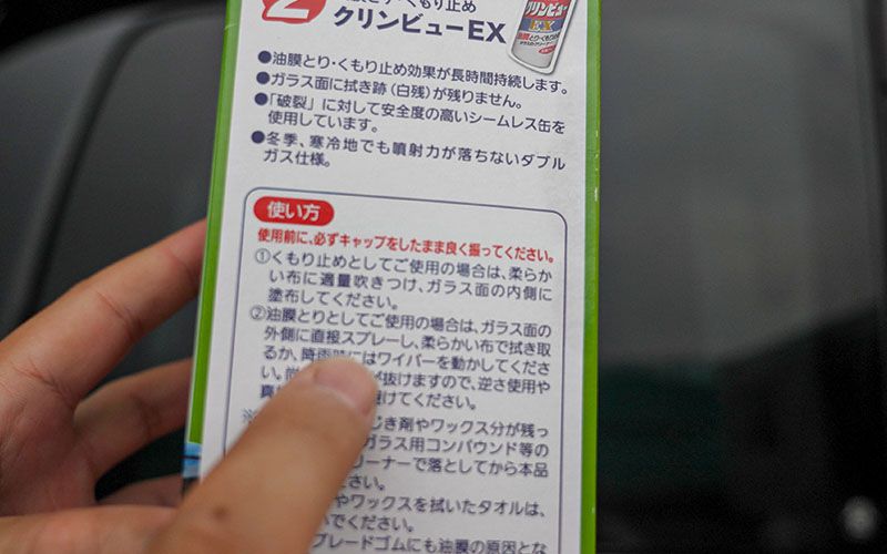 <内窓のくもり止め>使用前に缶をよく振り、泡が飛び散らないようにしながら柔らかい布に吹きつけ、フロントガラスの内面を塗布するように拭いてください。