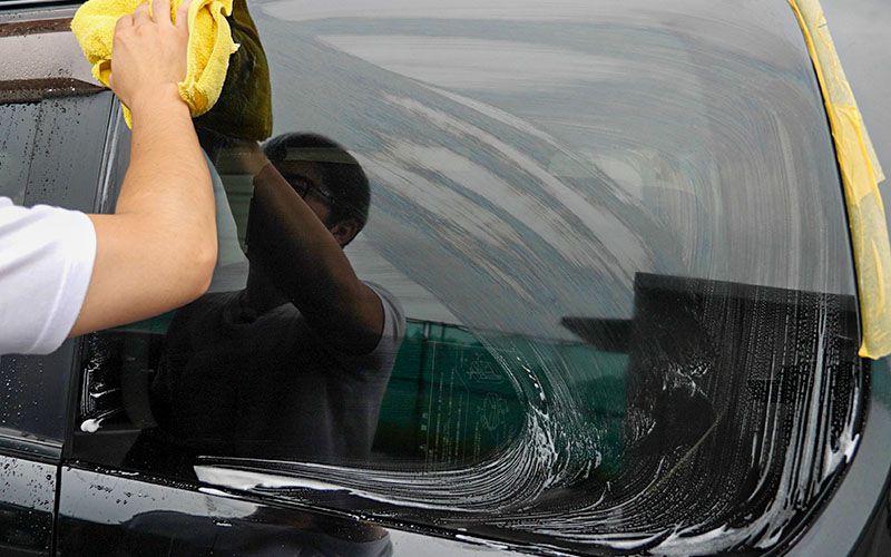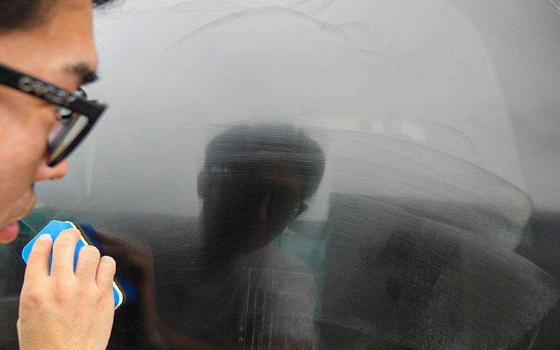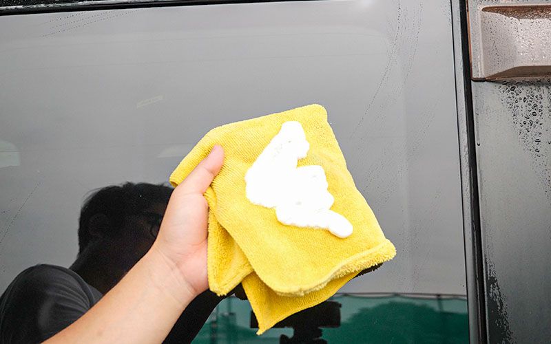 ②付属のスポンジに本品を取り、随時補充しながら円を描くようにガラス面に塗りこんでください。
