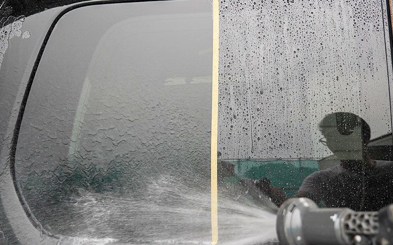 メーカーに問い合わせたところ、『ハイブリッドストロング』と『クリンビューEX』は撥水と親水で真逆のタイプなので、一緒に使うと効果がなくなってしまうということでしたが、あくまでも実験なので、全面に『クリンビューEX』を施工していきます!