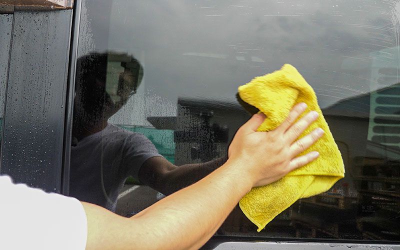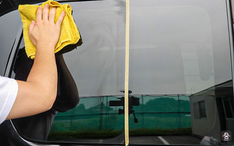 『クレンザー』はガラス面が乾いた状態での施工になるので、1回拭き上げました。