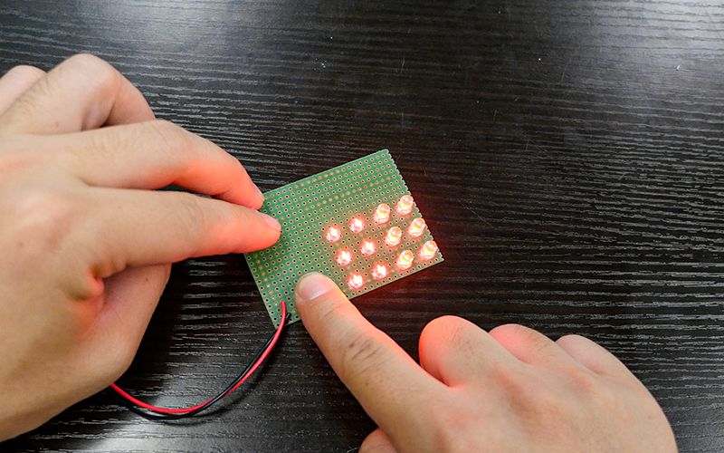 ステップ2は半田辺です。実際に自分で基盤にLEDと抵抗器をはんだ付けしました。ブレッドボードと違って自分で作った感があります。