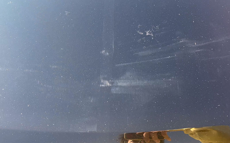 ⑤目立った小傷や水アカがある場合乾いている薄紫のマイクロファイバークロスを塗布し該当の部位を重点的に磨いていく