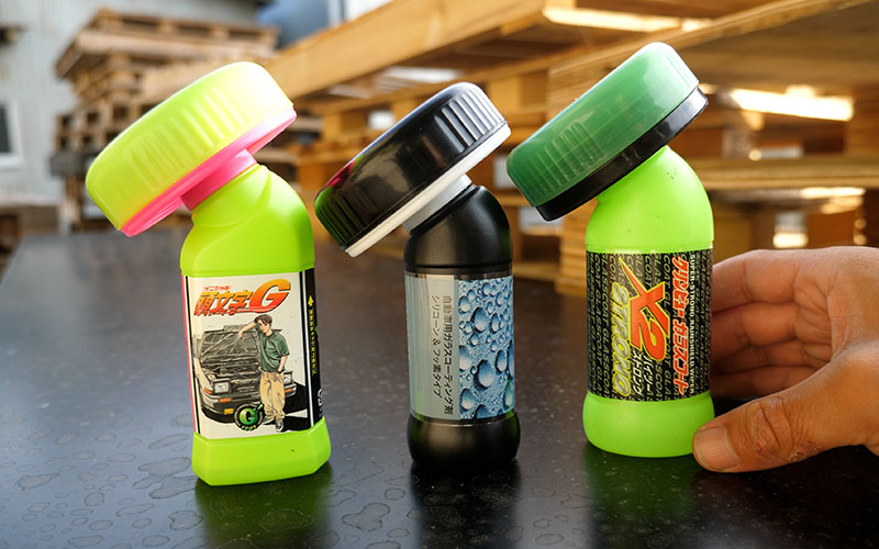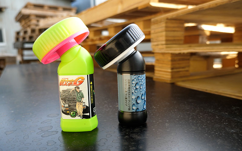 左が頭文字D仕様なんですが『ハイブリッドストロングα』です。右がカインズの撥水剤です。
