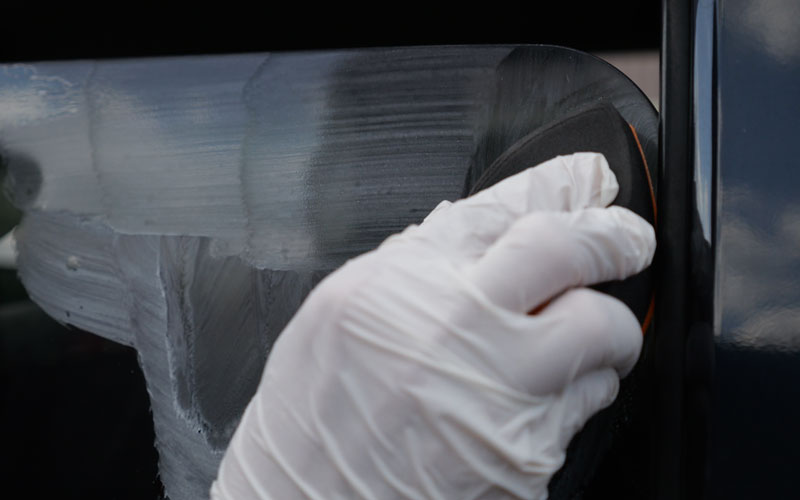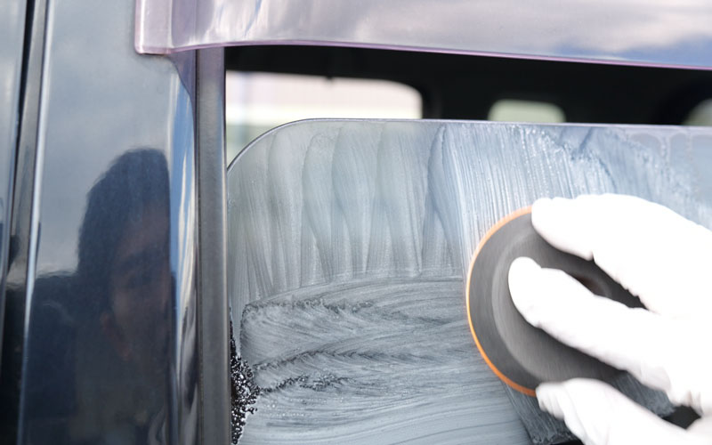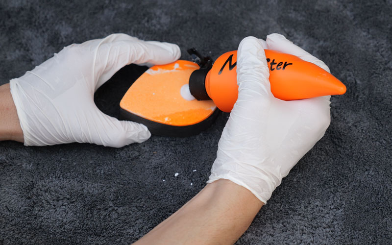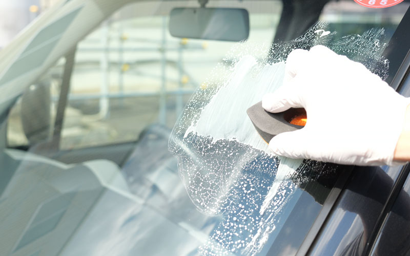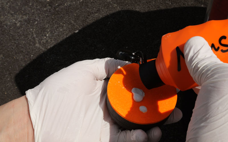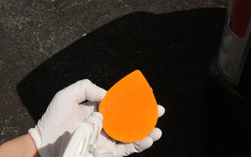 ② ティアドロップパッドに少し水を含ませ、オレンジ色面に本液を直径2cm程度付け、ガラスに押し当て力を入れず約20cm四方で上下・左右に往復させてください。