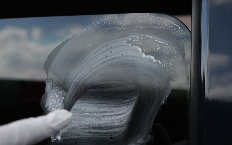 20cm四方で擦っていきます。白い液剤が弾く場合は、弾かなくなるまでガラスを擦っていきます。