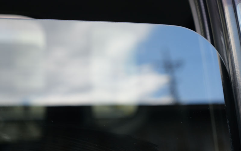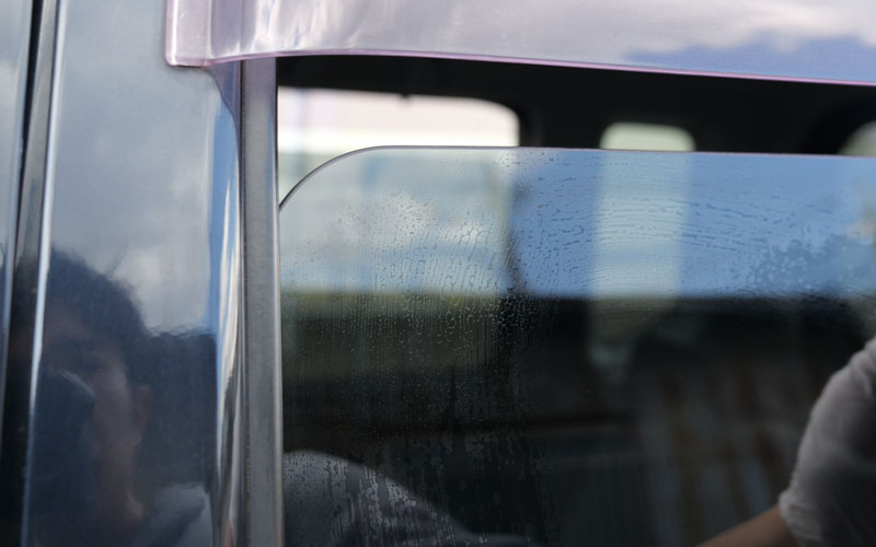 右側はレインモンスターリセットを使用していて、左側は未施工です。ガラスをサッと拭いた時に未施工のところは少し水が弾く感じがあります。これは油膜や古い撥水剤、その他の汚れが残っている証なんですが、施工したところはきれいに親水状態になっています。