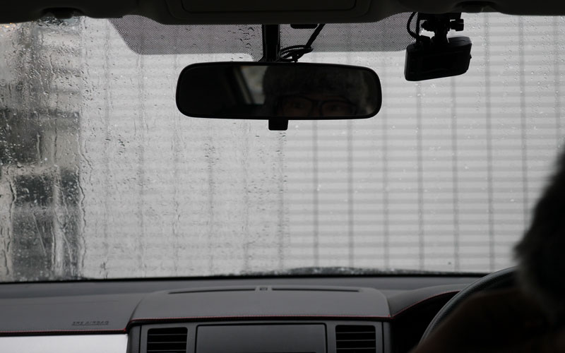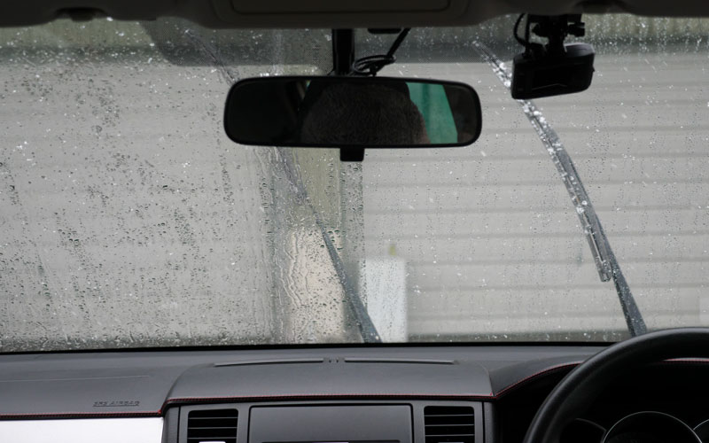 撥水剤が施工されていない助手席側は水を弾かないのでモザイクのような状態です。逆に運転席側は撥水剤が施工されているので視界良好です。この差は一目瞭然です。