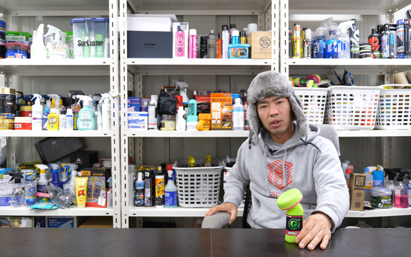 そうしたら運転席側だけ撥水剤(『ハイブリッドストロングα』)を施工していきます。
