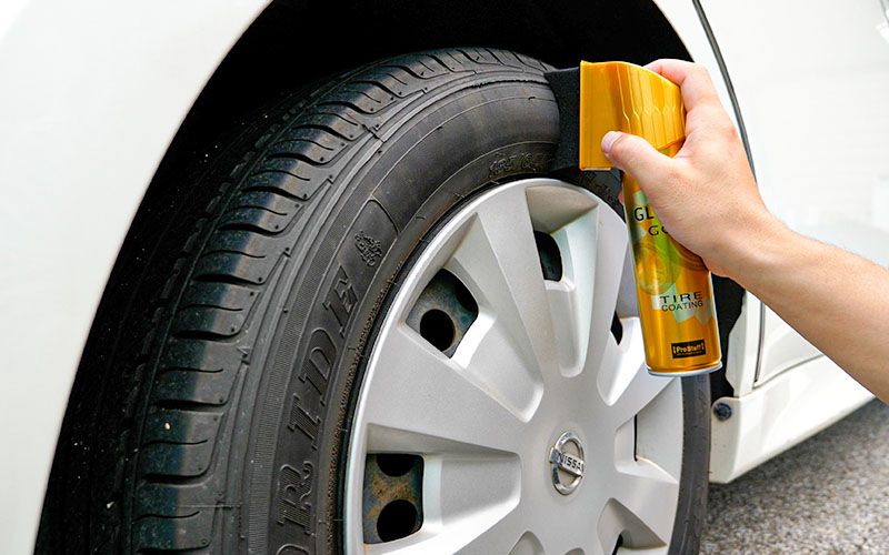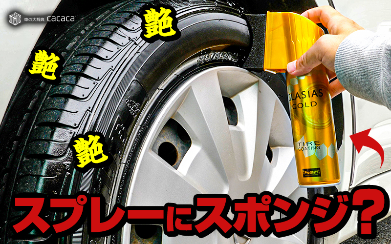 『グラシアスゴールドタイヤコーティング』はスプレータイプでヘッドにスポンジが付いているのが特徴で、タイヤにフィットさせてスプレーをするので飛び散らないという画期的な商品です。