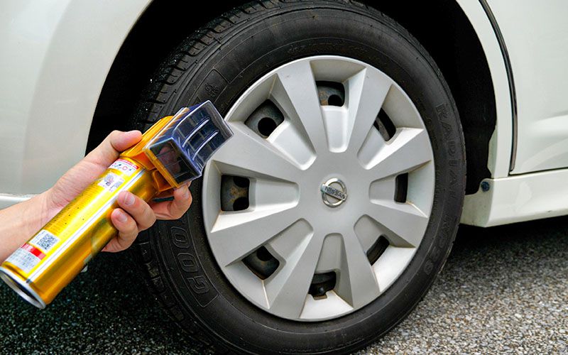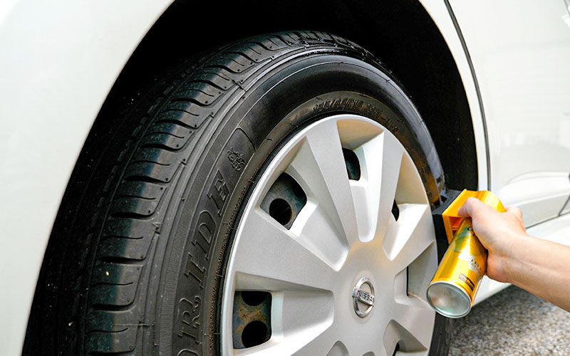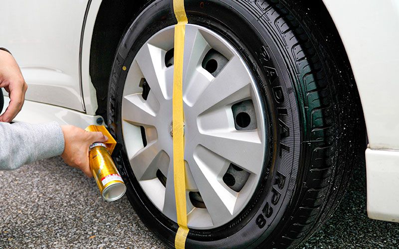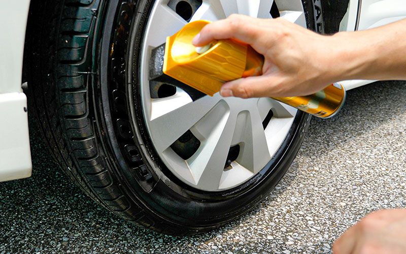 タイヤに密着させ1秒スプレーします。最初はスポンジに液が染み込んでいないので、あまり塗れませんね。