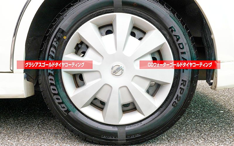 今回はプロスタッフのタイヤコーティング剤『グラシアス ゴールドタイヤコーティング』を使って、最後に『CCウォーターゴールドタイヤコーティング』との比較を行いました。