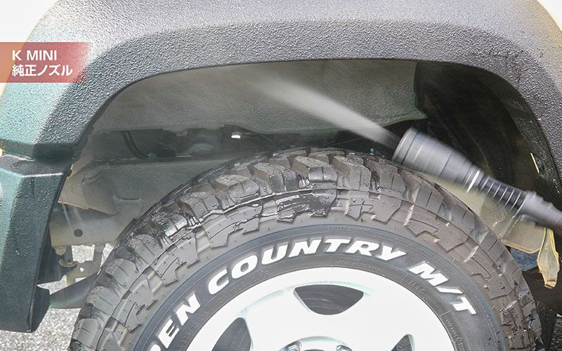 車を純正ノズルで洗ってみます。車の真下は凍結防止剤が走行した時に巻き上げて車の下に付いた時などに洗うことがあります。