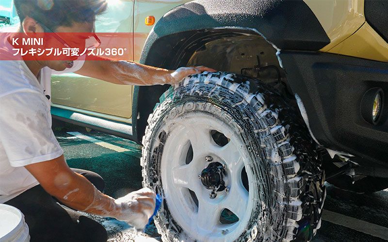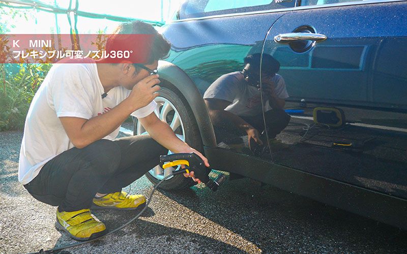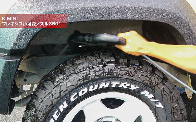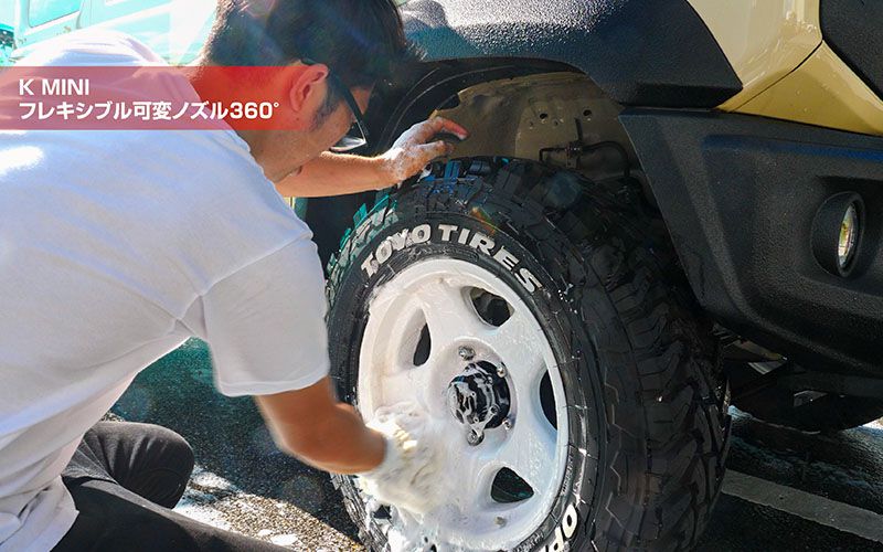 そこで登場するのが『フレキシブル可変ノズル』です。小さいので裏にも入るし、角度を変えればタイヤの下もできちゃいます。