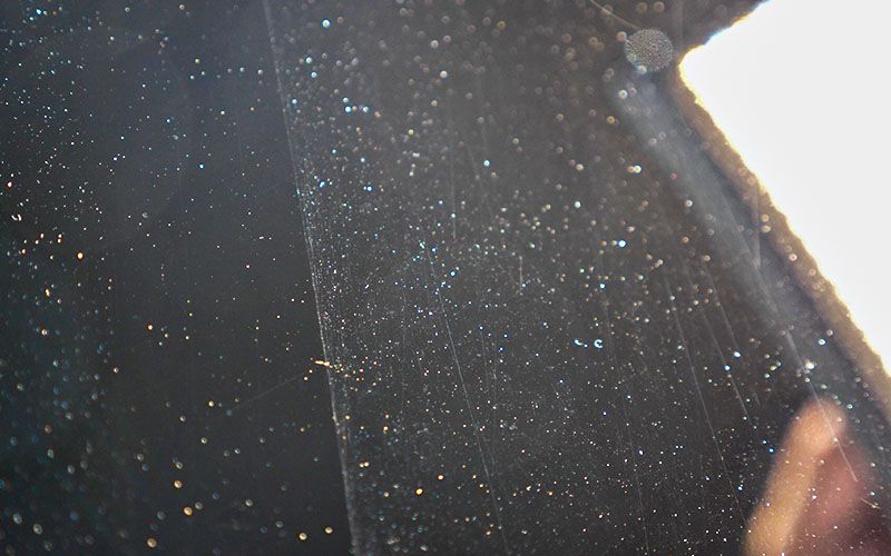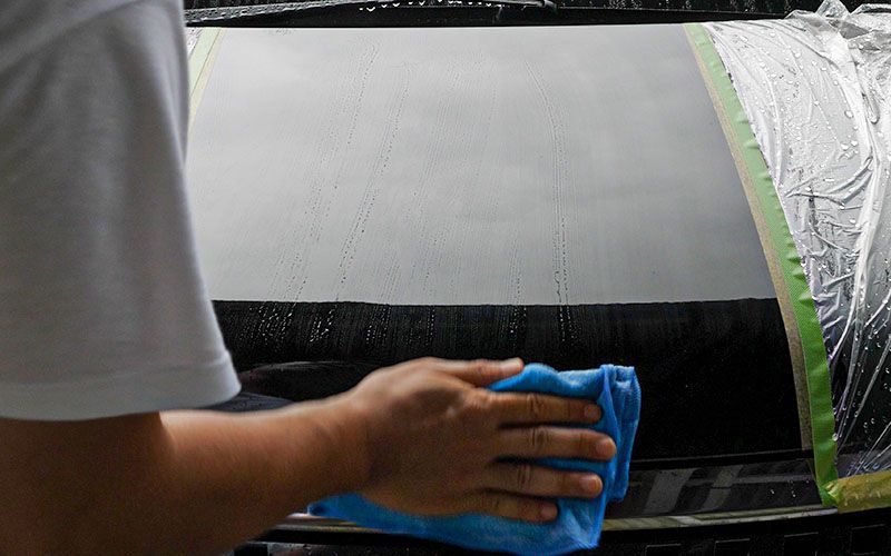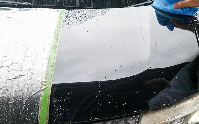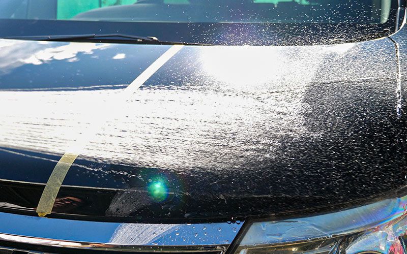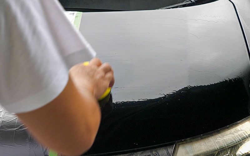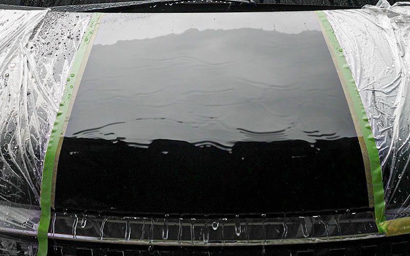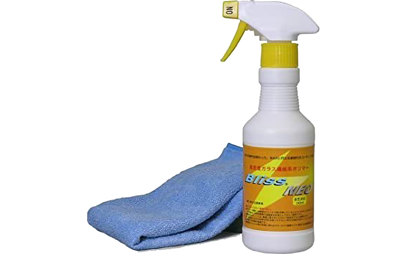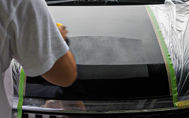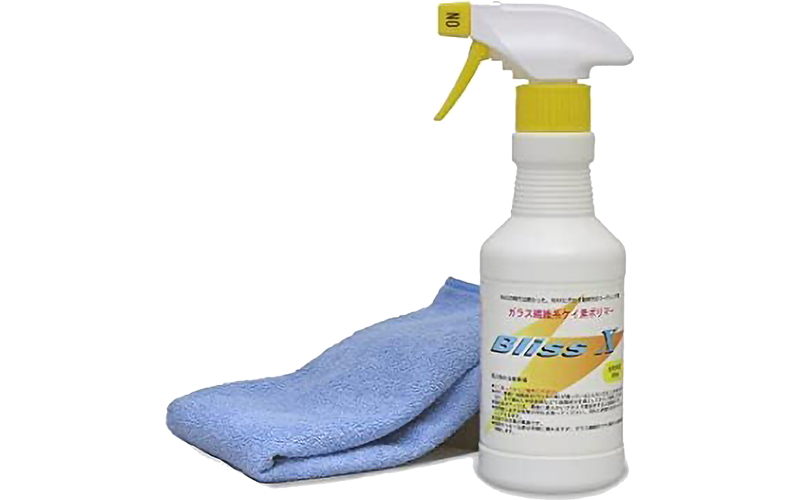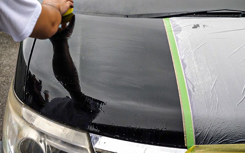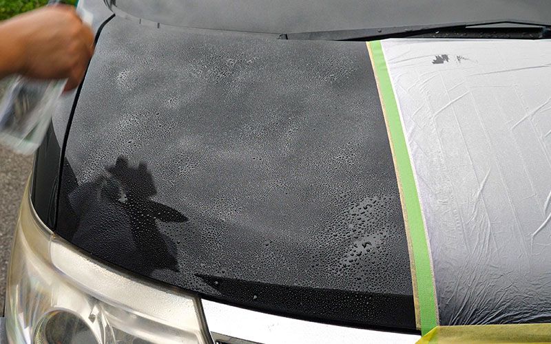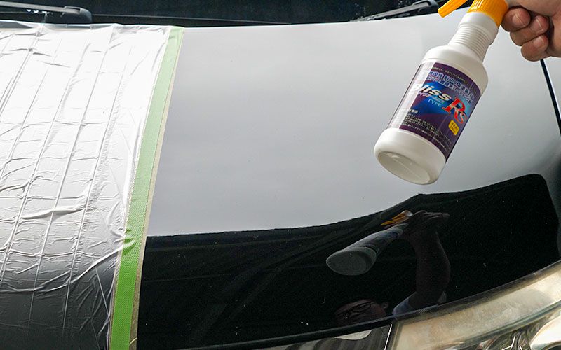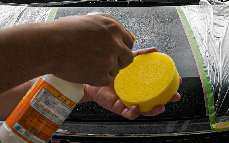 『ブリスエックス』から施工していきます。ブリスは濡れた状態で施工しますが、今回は下地処理で磨いているため、水をかけてもすぐ引いてしまうので、霧吹きで水を全体にかけます。