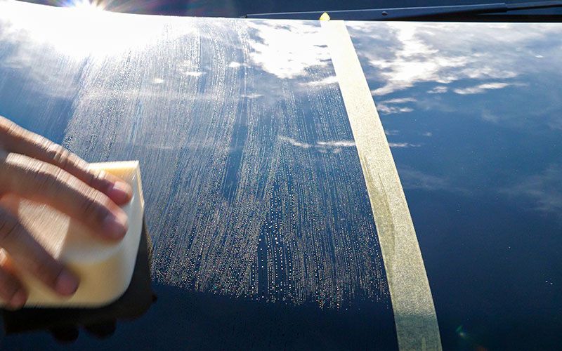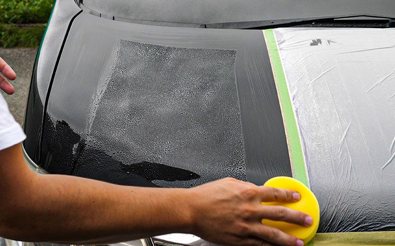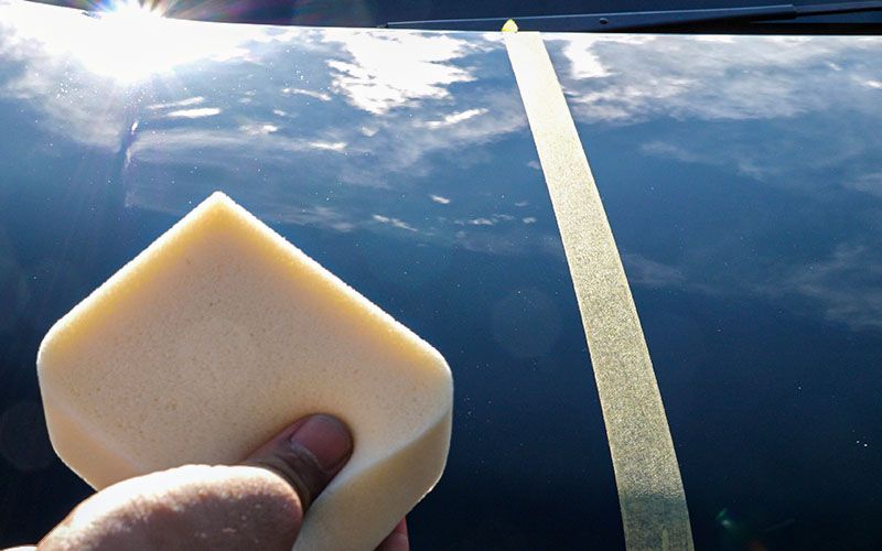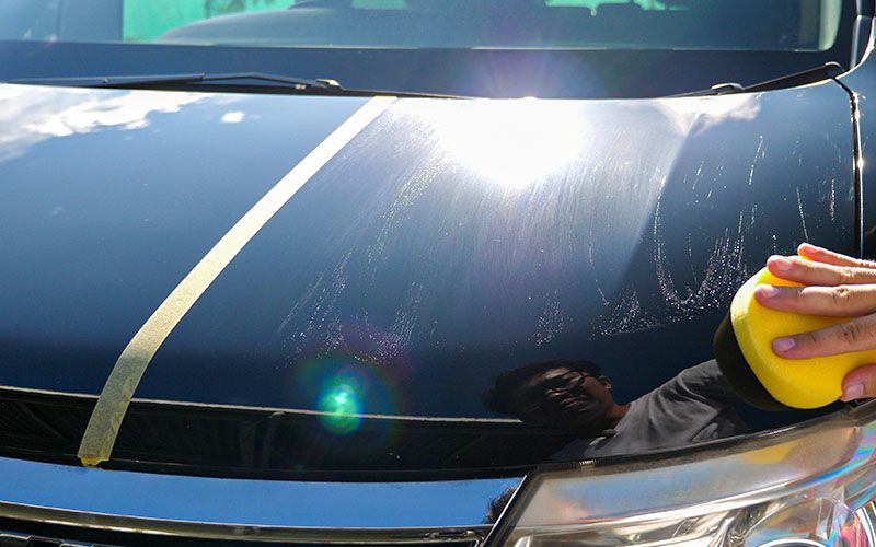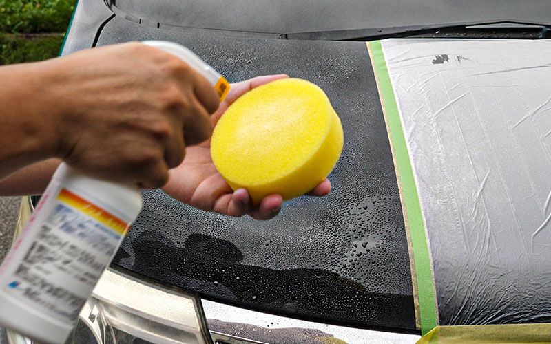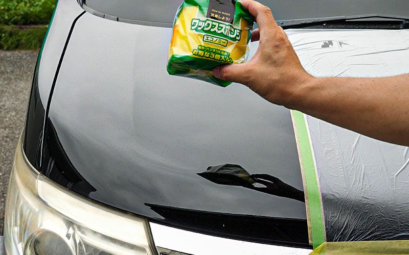 霧吹きで車全体を濡らしたので、さっそく塗っていきます。スポンジに3プッシュしました。