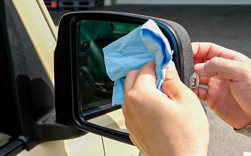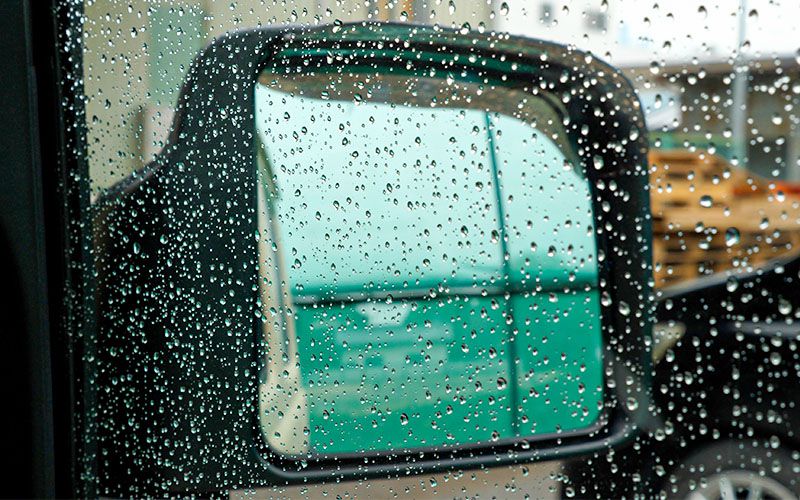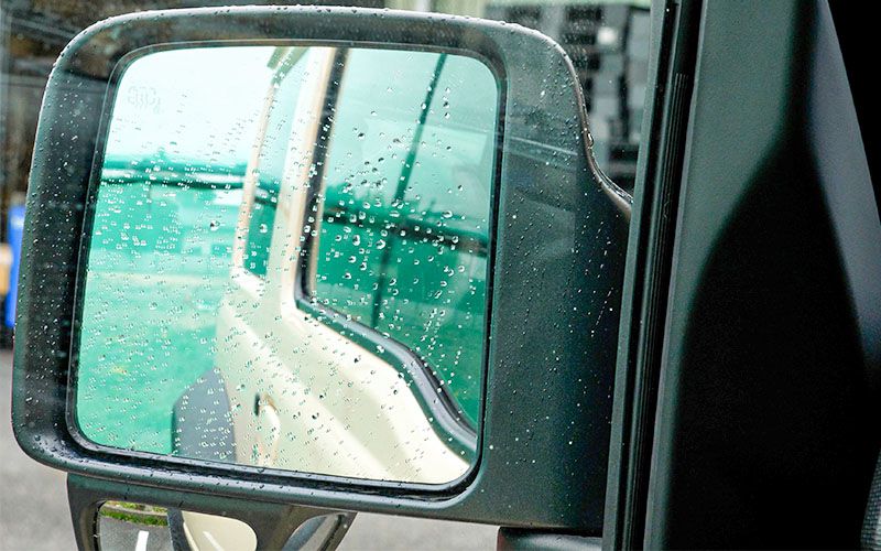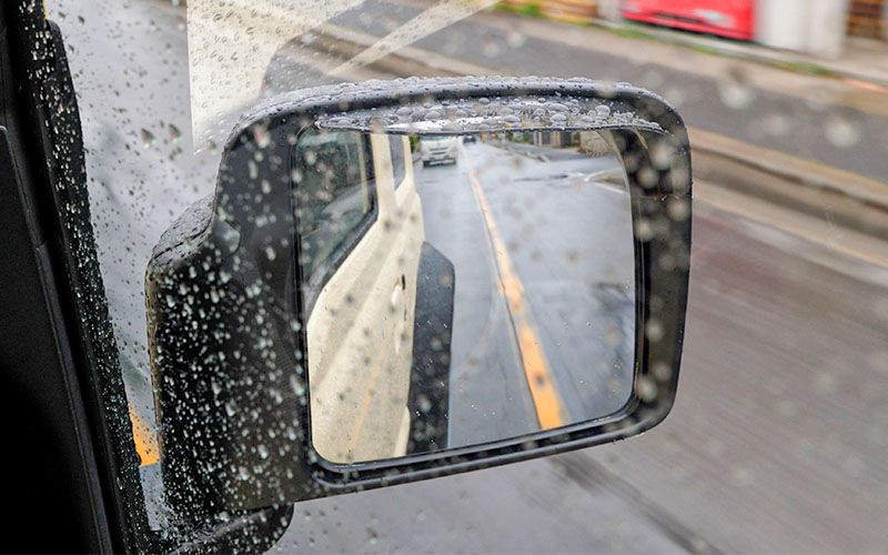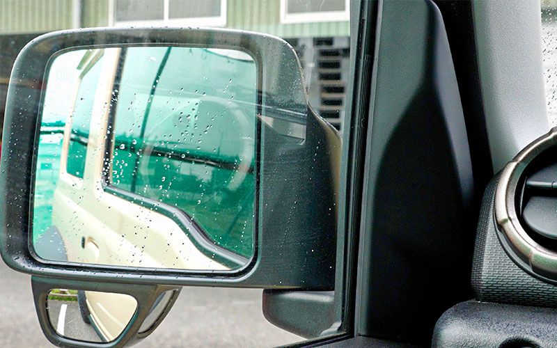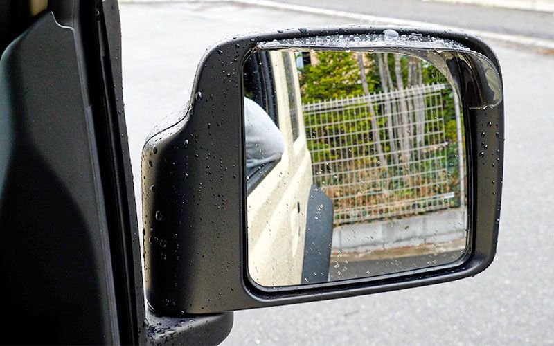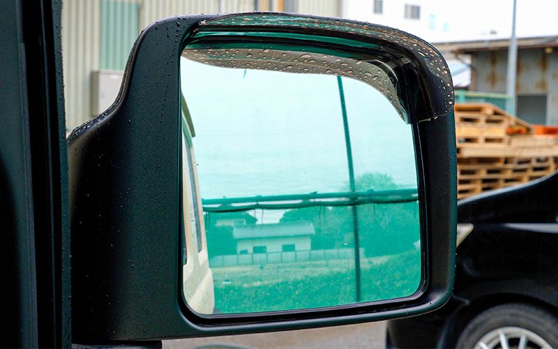 バイザーが付いていない方のサイドガラスはそこまで濡れていませんが、サイドミラーには水滴が付着しています。