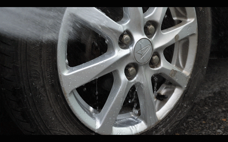 ホイールの左面だけホイールクリーナーで綺麗にしました。右面は未施工なので、水かけて撥水を比較したいと思います。