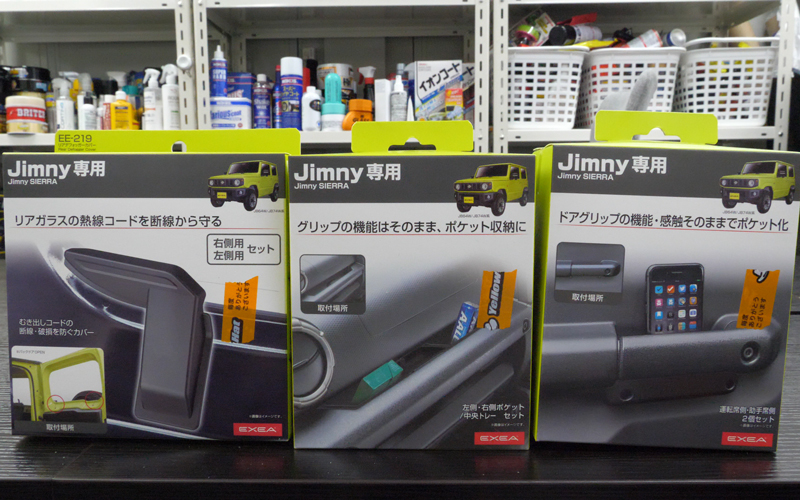 今回購入したのは『ドアグリップポケットベース』『アシストグリップポケット』『リアデフォッガーカバー』の3つです。全てジムニー (JB64) 、ジムニーシエラ (JB74) 用のパーツになります。