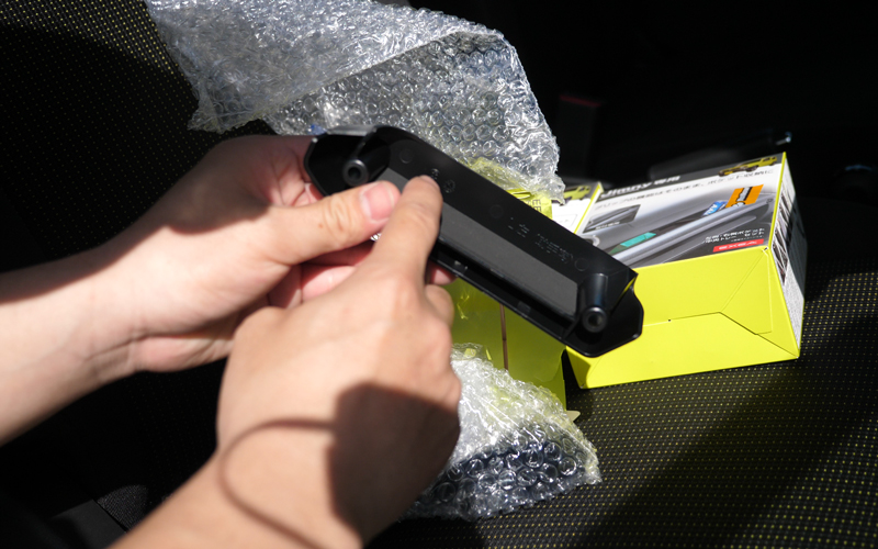 まず中央トレー (一番小さい部品) をアシストグリップの中央に置きます。広い方が手前です。ちなみに僕は仮で取り付けたかったので両面テープは剥がさずに取り付けます。