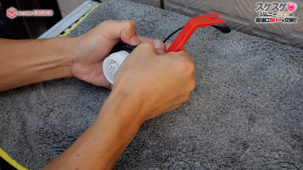 よし これで外れました。このコードを取りたいので給油キャップを外します。