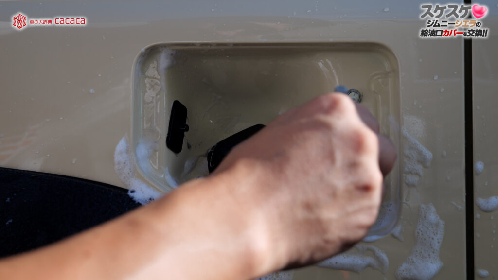 これ1個注意点なのですが、結構汚れがひどい場合、アルカリ系のシャンプーを使っても悪くはないです。ただ、汚れは分解しやすいんですが、この給油口の中 蓋の裏側とか特にそうなんですが、結構クリア塗装が入ってないことがあるんですよ。