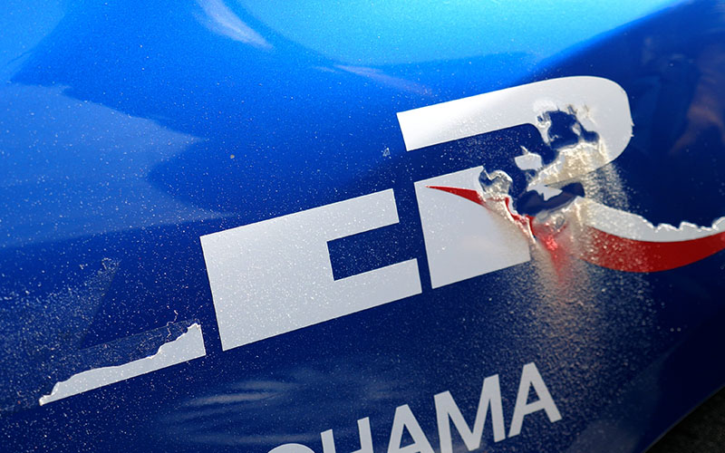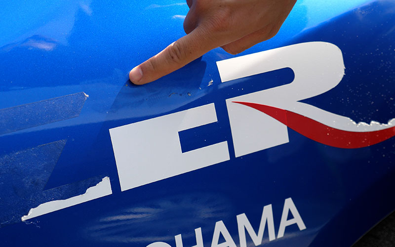反対側はZEROMAXの部分を全て剥がしましたが全部跡が残ってます。YOKOHAMAも残ってます。ですがYOKOHAMAの下に貼ってあったZESTINOは綺麗に剥がれました。だから本当にステッカーによるという感じです。