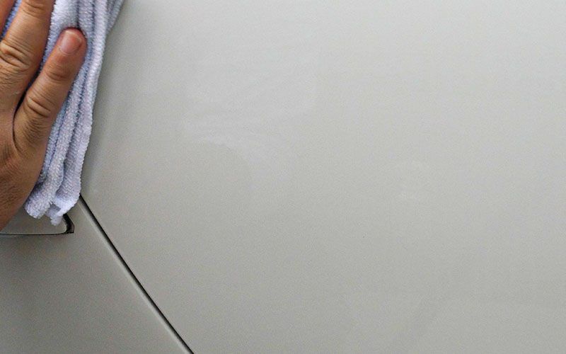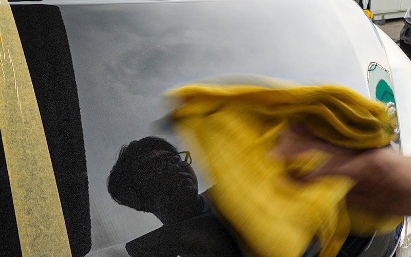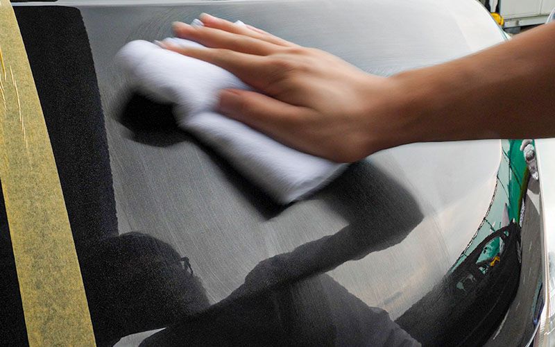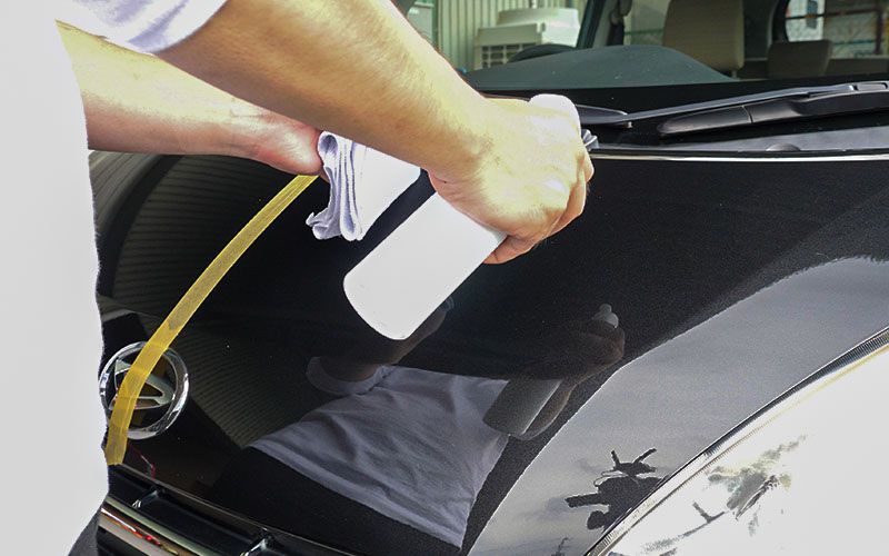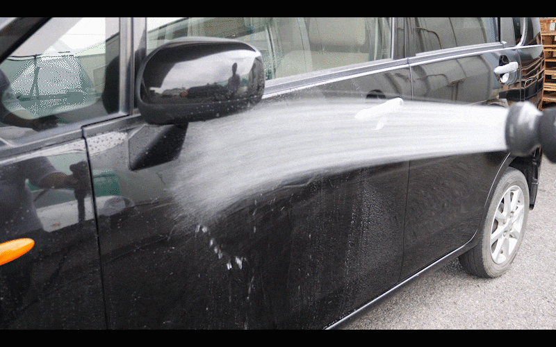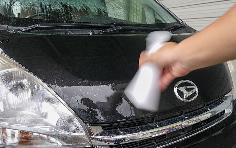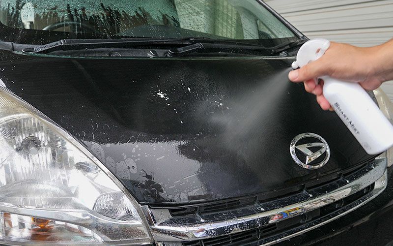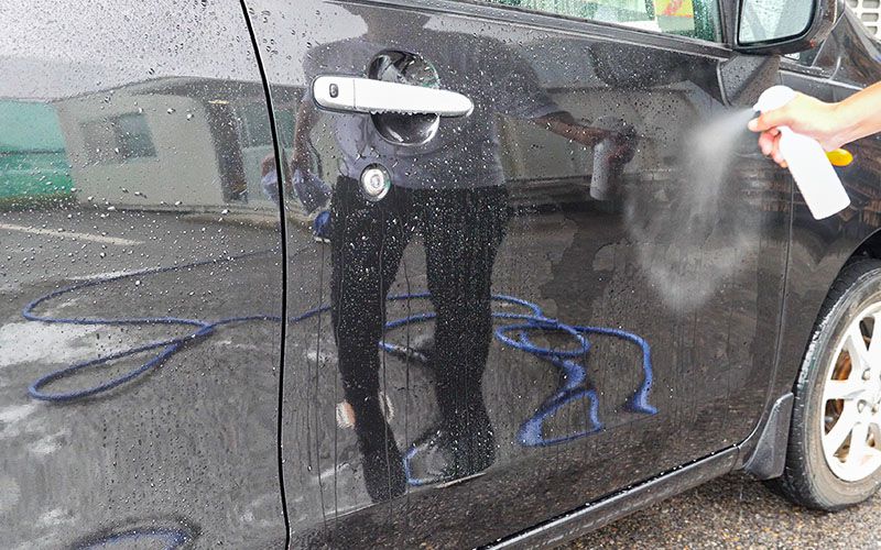 ②濡れたボディやガラスにスプレーします。