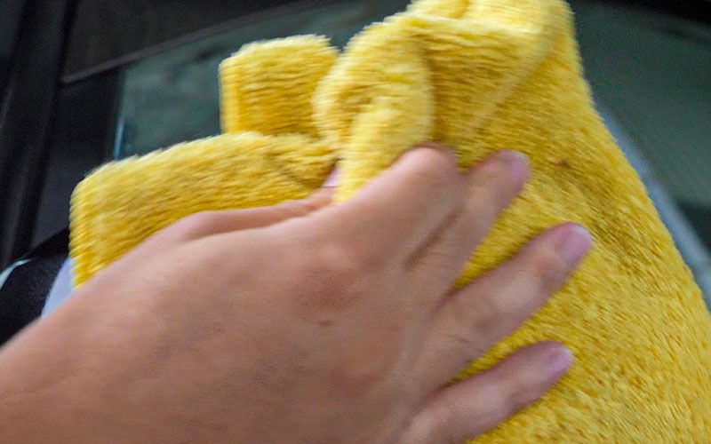 ③スプレー後、すぐにマイクロファイバークロスや綿タオルで液剤を塗り広げるように拭き上げてください。※クロスの水滴はこまめに絞りながら拭いてください。
