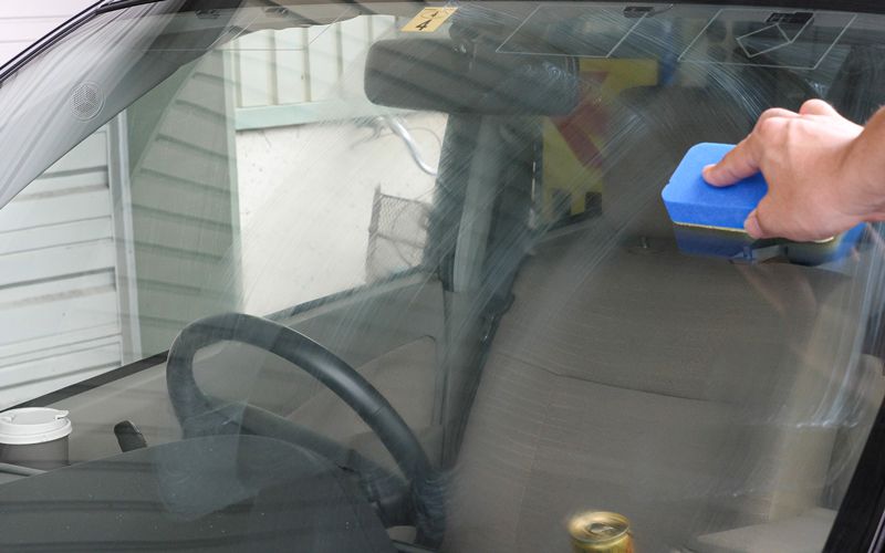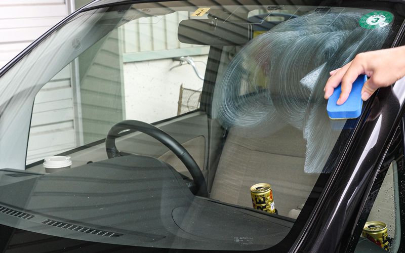 ②付属のスポンジに本品を取り、随時補充しながら円を描くようにガラス面に塗り込んでください。