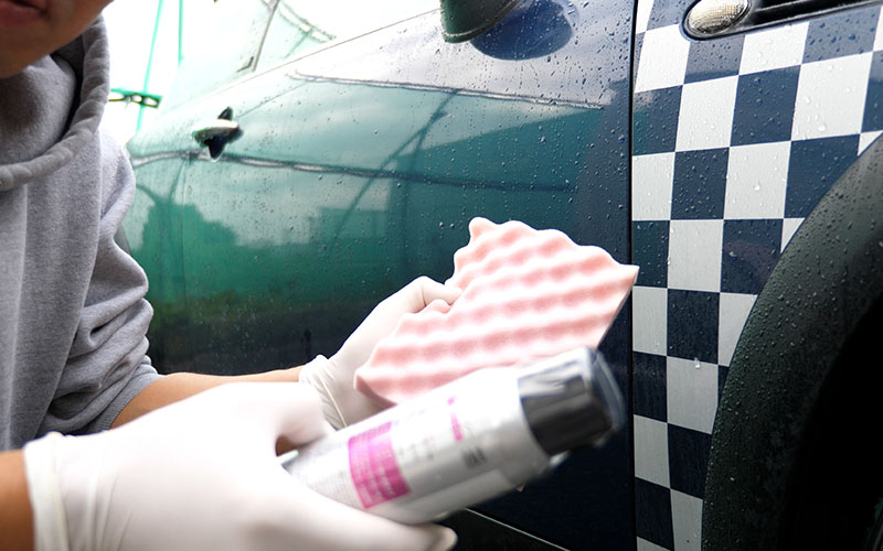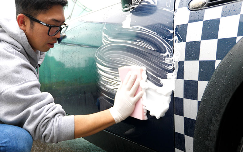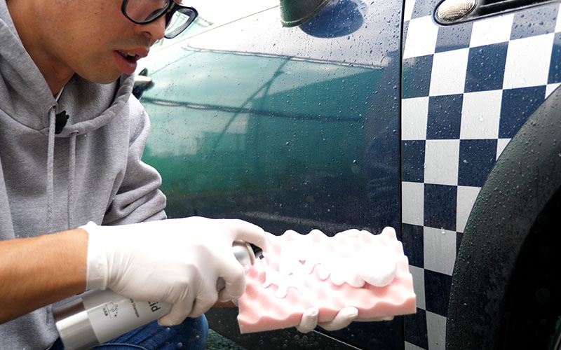 ボトルをよく振り、洗車用グローブやスポンジ等に直接スプレーし、優しく洗ってください。