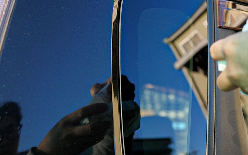 ①ガラス面に水や下地処理剤が残っていないことを確認する
