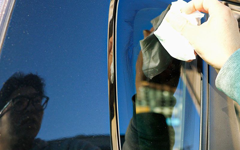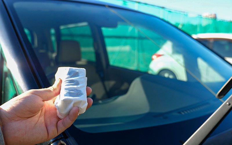 ②専用の施工ツールにティッシュペーパーを巻き付け それを用いてガラス面に液剤を塗布する
