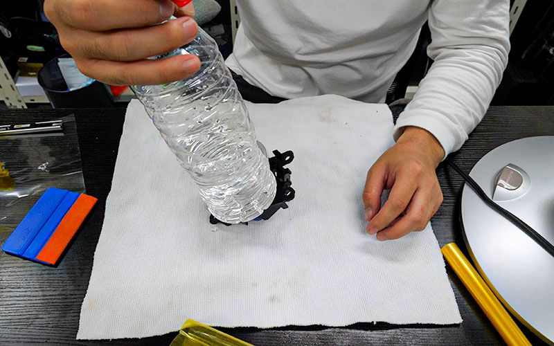 乾いた状態でフィルムを貼るのは僕には難しかったようです。なので、今回はガラスのフィルムを貼るように濡らした状態でレンズフィルムを貼ってみます。