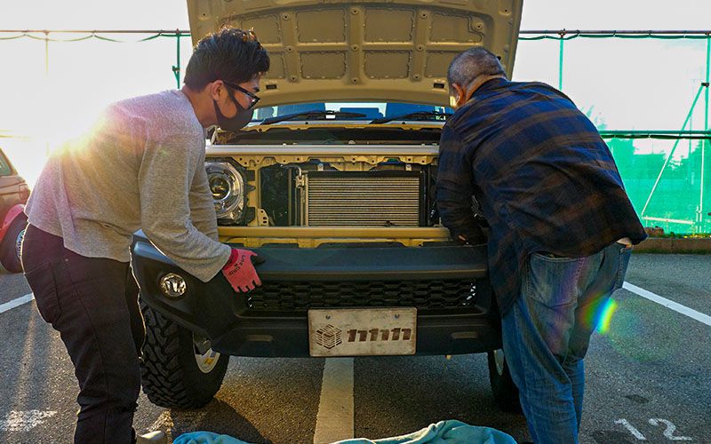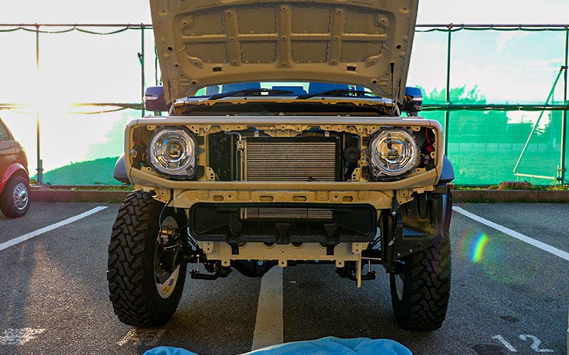 お馴染みのジムニーシエラです。まずはグリルとバンパーを取り外します。