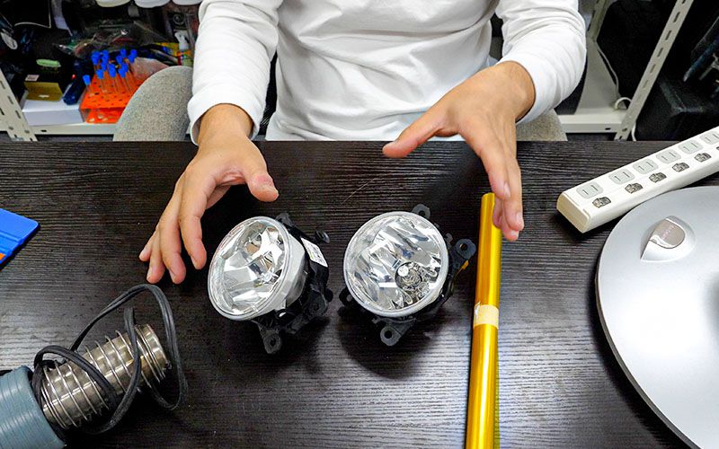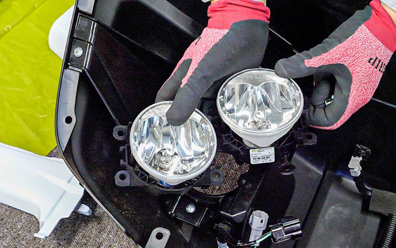 左右のフォグレンズを取り外すことができました。室内でフィルムを貼っていきます。