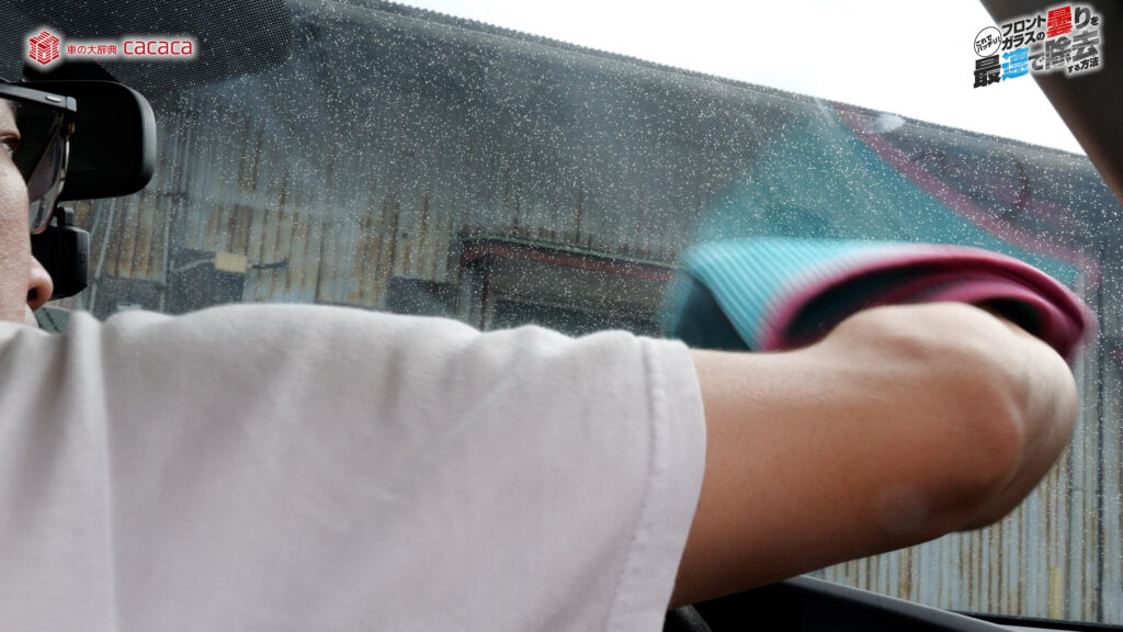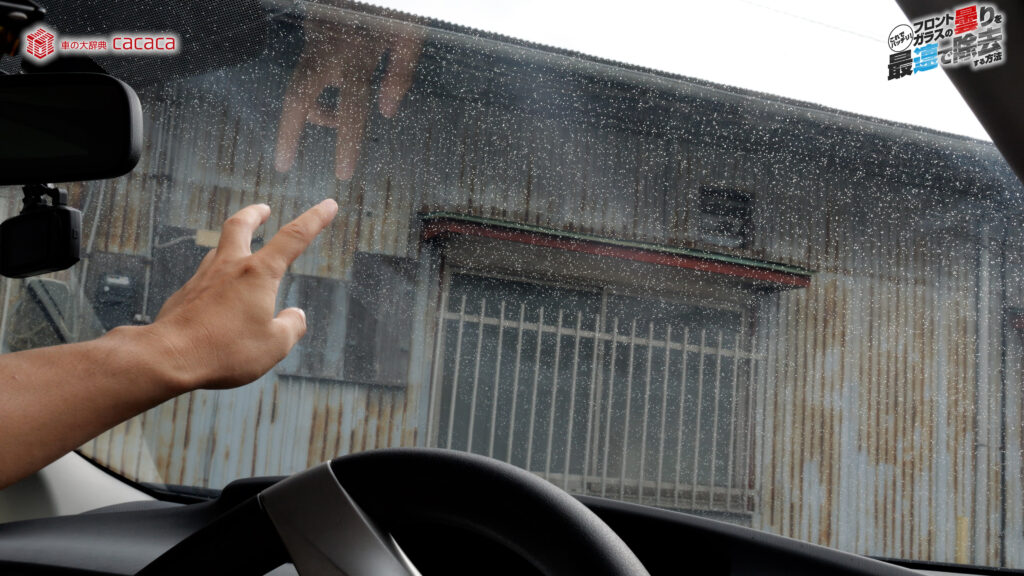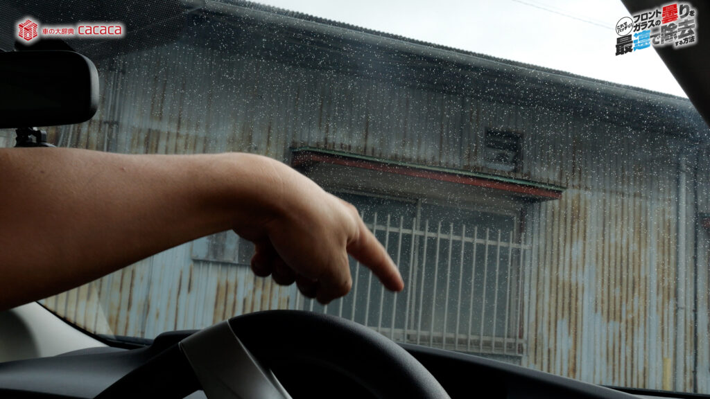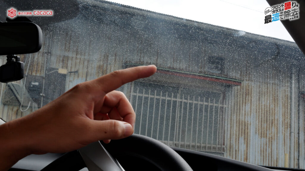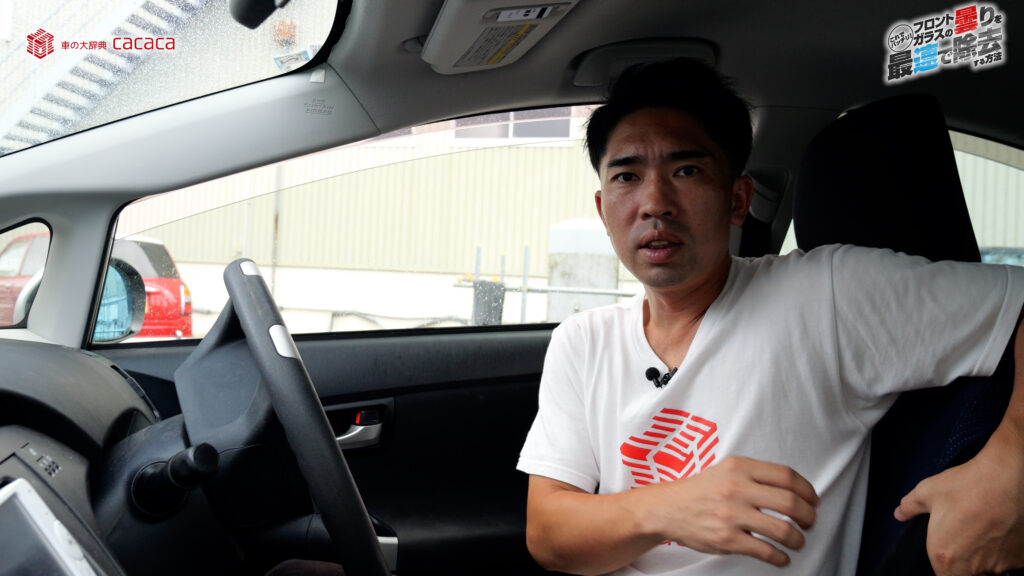 「どうして汚れるの?」って思いますよね?意外に、車に乗り降りしたり窓を開けたりすると、外から空気が入ってくるんです。その空気には、微量の油分なんかが含まれていて、それがガラスに付着して汚れちゃうんですよね。