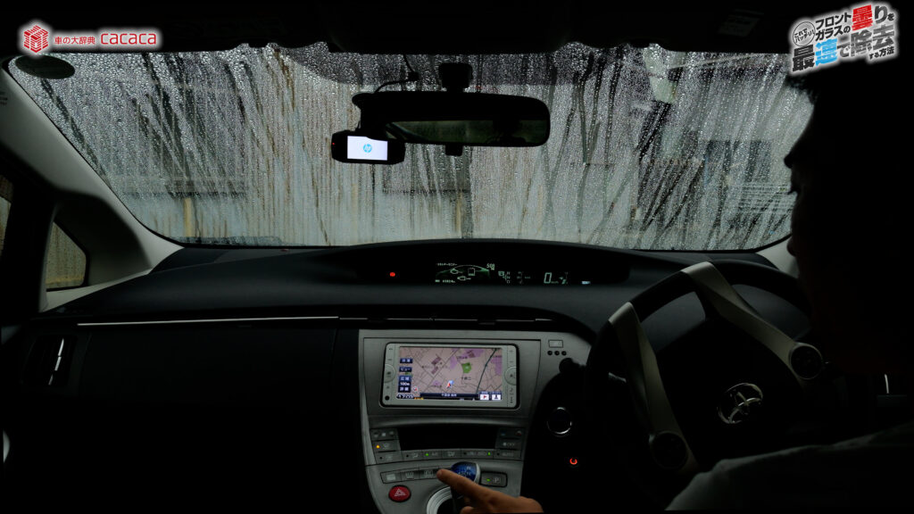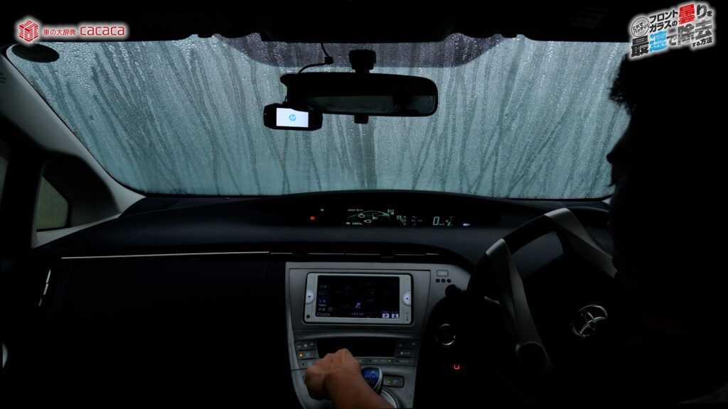 現状ではフロントガラスは曇っていません。ですが、今から行うのは「わざと曇らせる」ということです。外気温は少し暖かいくらいで、現在はエアコンが付いているので曇ることはありません。