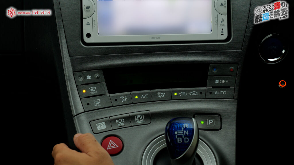 AC、これはエアコンのことです。今の車は本当に頭が良くて、デフロスターを押すと自動的にこのエアコンもつきます。