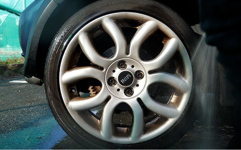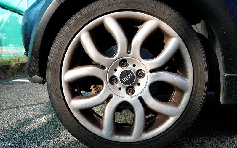 今回使用するミニのホイールです。メッチャ汚いですね!洗っても1~2週間でこうなるから本当に嫌になる…。