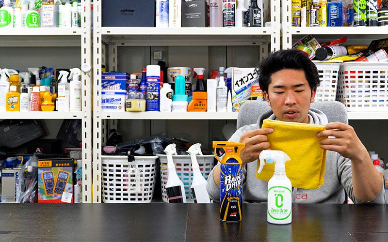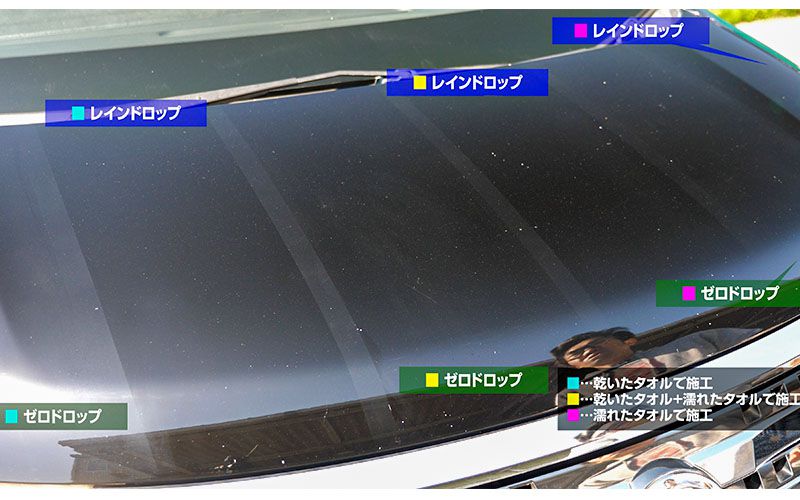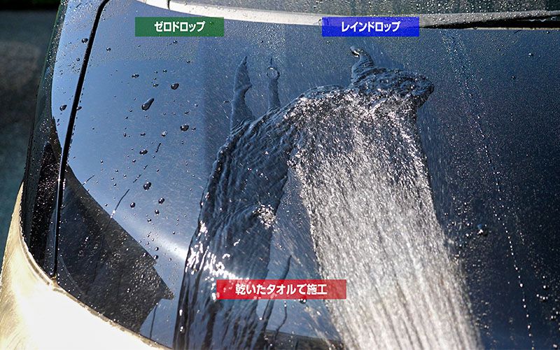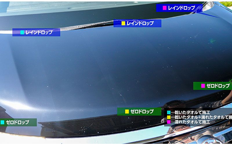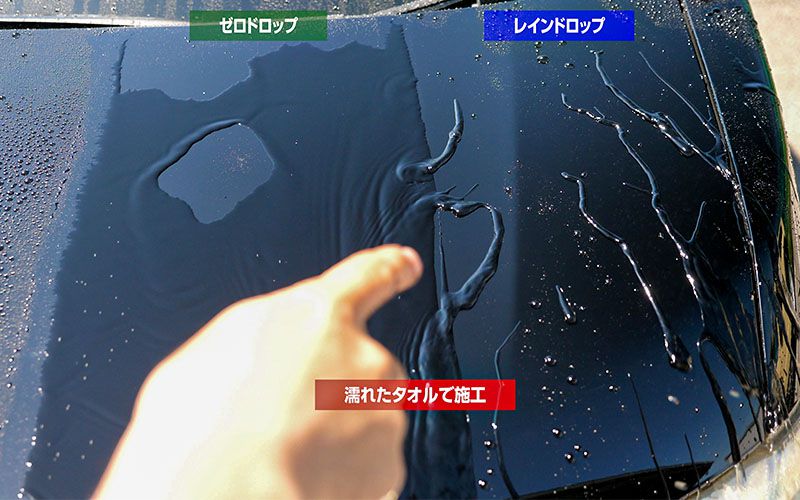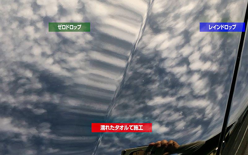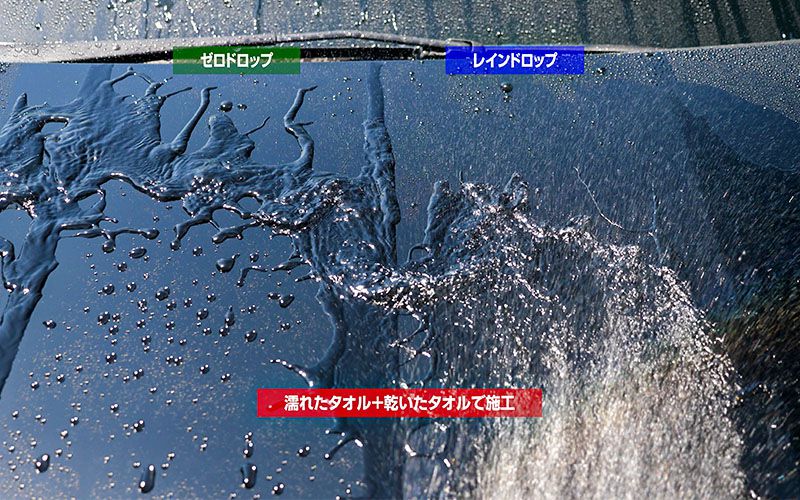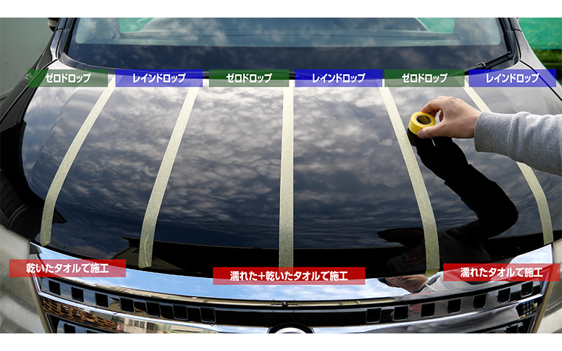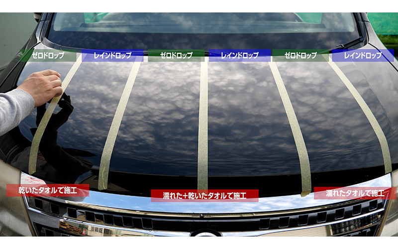 今回は『レインドロップ』と『ゼロドロップ』を「濡れたタオル」「濡れたタオル+乾いたタオル」「乾いたタオル」で施工して、どんな違いがあるのか検証してみました。