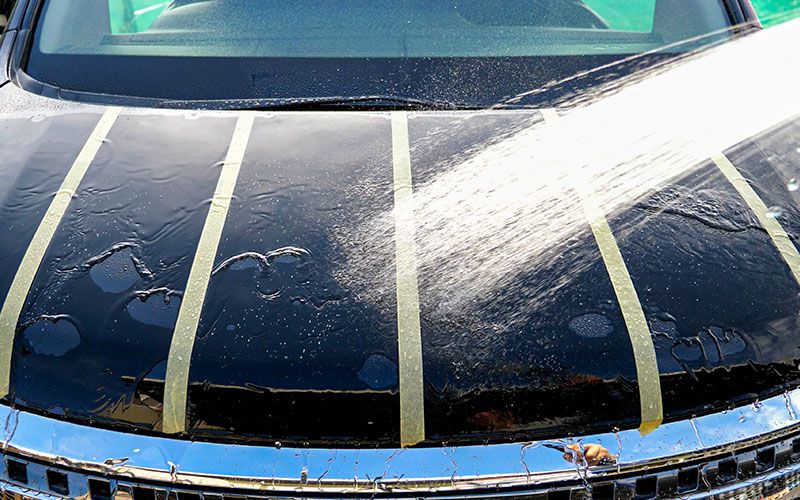②濡れたボディやガラスにスプレーします。※使用量は、1m四方に1秒が目安です。