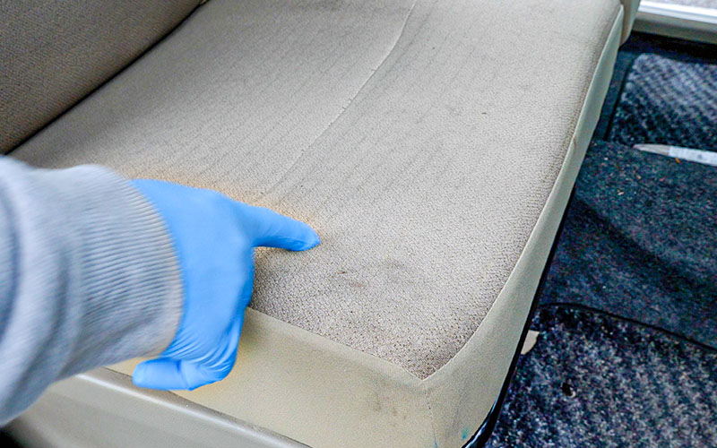 かなり目立つ汚れがありますね。カーペット用に希釈した『マイペット』をタオルに吹きかけて揉み込んだら、汚れを叩きます。