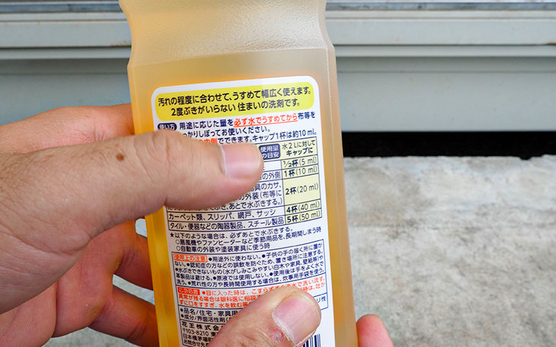 『マイペット』の裏側には使用用途によっての希釈率が記載されており、車の内装は水2ℓに対してキャップ2分の1杯ですね。