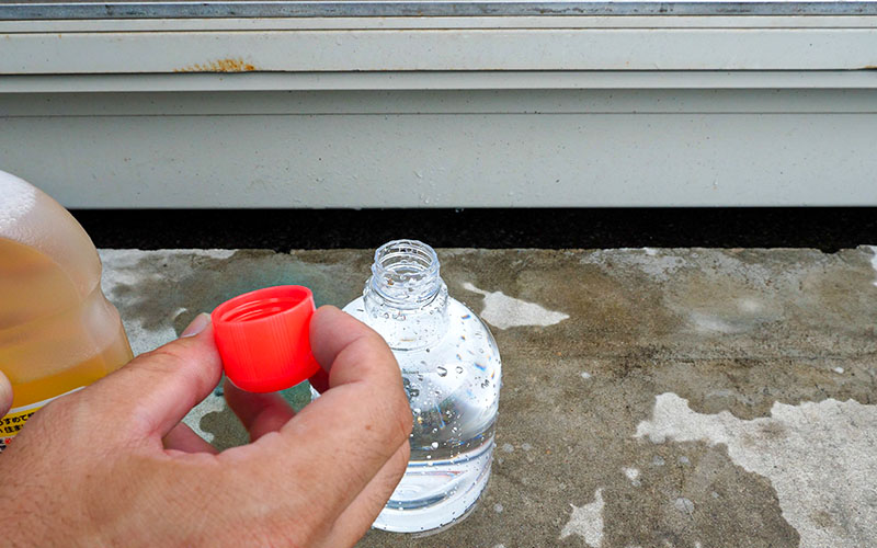 水2ℓ用意して、キャップ2杯入れました。あと水拭きが必ず必要ということなので、水拭き用のバケツも用意します。