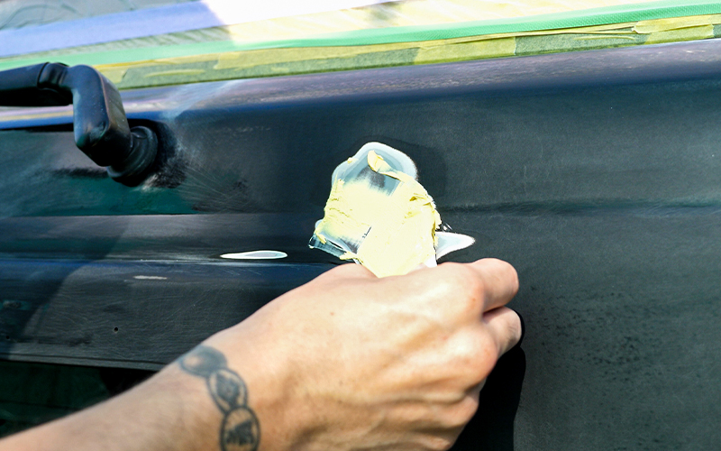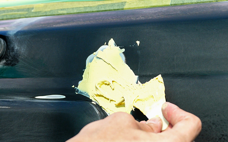 - 使う量を決めたらパテと硬化剤を混ぜます(※量の比率に関しては、パテ100に対して硬化剤は2~4%程度が理想的です)