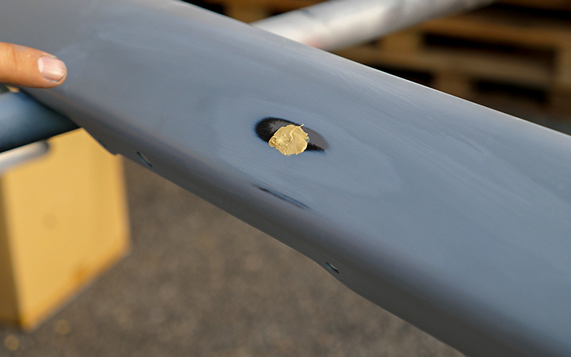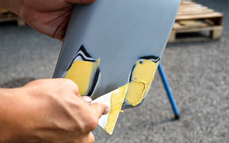 - パテ(硬化剤入り)を十分に混ぜたら補修をする部分に押さえつけるようにパテを盛っていきます(※5~15分程度で硬度が増してくるので素早く作業をしてください)